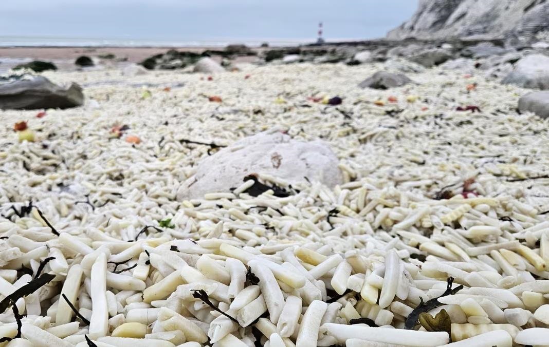 На пляж на південному сході Англії потрапила велика кількість картоплі фрі та цибулі, яка випала з контейнеровозів під час шторму. Це стало загрозою для мешканців моря, оскільки пластикове пакування може бути сплутане з їжею тваринами. Люди почали прибирати пляж від пластикових пакетів і продуктів, щоб захистити морських мешканців, зокрема тюленів, які живуть у цьому районі. Рятувальна компанія також здійснює операції щодо вилучення втрачених контейнерів з їжею, щоб запобігти подальшому забрудненню пляжу та моря.
